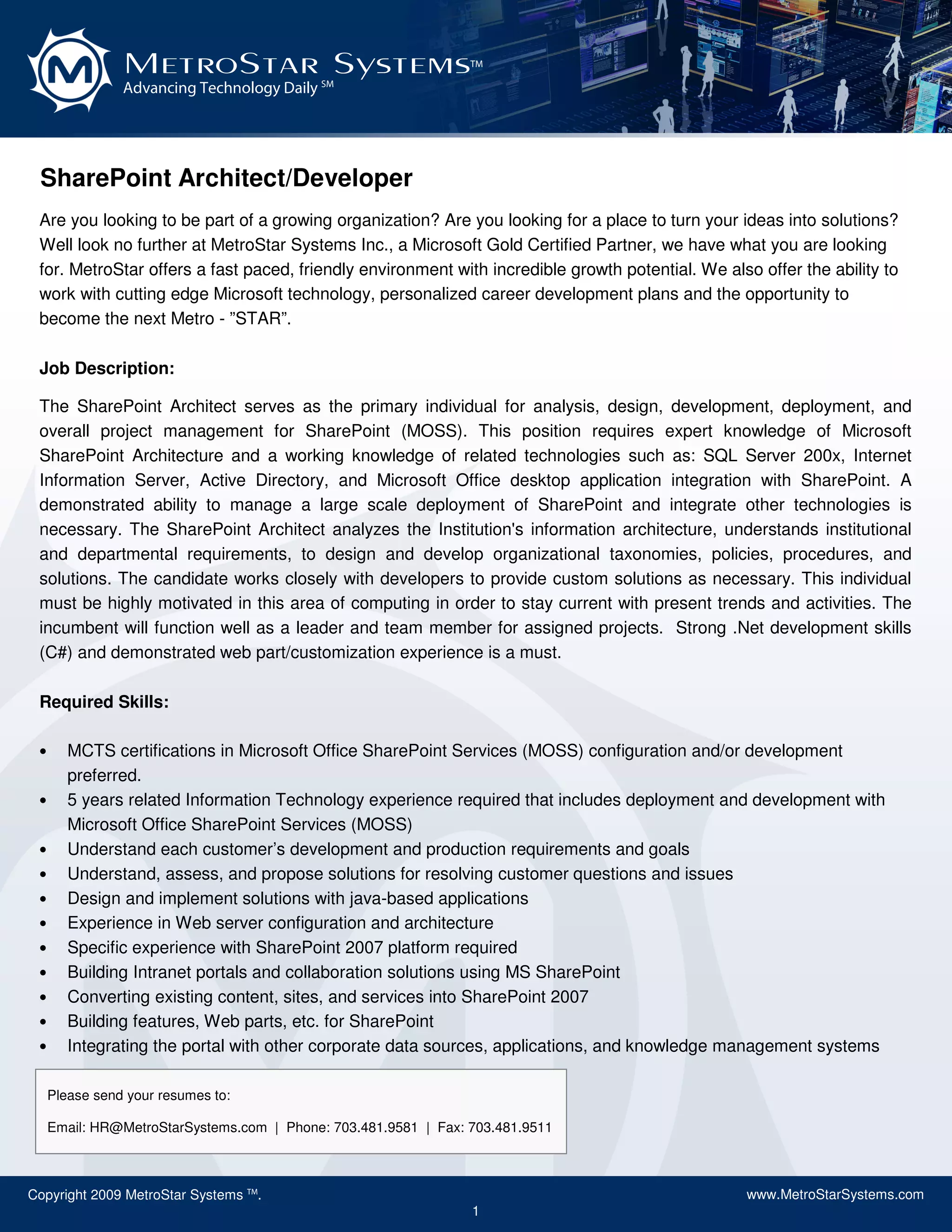 MetroStar Systems is seeking a SharePoint Architect/Developer. The ideal candidate will have 5+ years of IT experience including SharePoint development and deployment. Responsibilities include analyzing information architecture, designing solutions, and closely collaborating with developers. Strong .NET and SharePoint skills are required as well as experience customizing templates, building features, and integrating SharePoint with other applications. The company offers a competitive benefits package and opportunities for career growth.