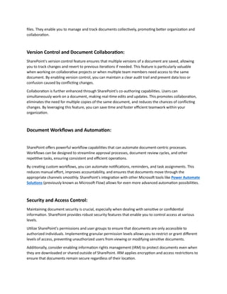 This document provides tips and tricks for utilizing SharePoint as an effective document management system, focusing on features like document libraries, version control, collaboration, and automation. It emphasizes the importance of organizing files with a logical structure, leveraging metadata, and using SharePoint's workflow capabilities to improve efficiency. Additionally, it highlights security measures and search functionalities to enhance document access and retrieval.