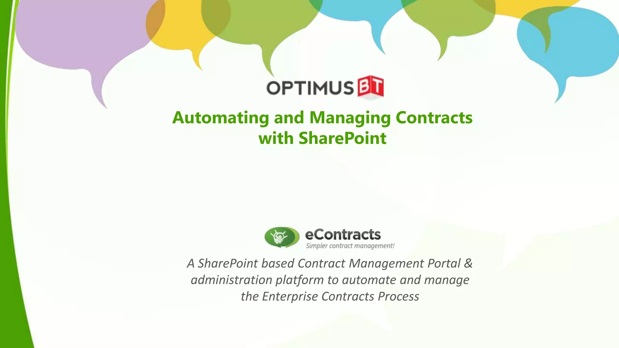 The document outlines a SharePoint-based contract management system designed to automate and streamline the management of enterprise contracts, enabling better visibility and control over contractual obligations. It details various features including self-service contract creation, vendor and customer management, and integration capabilities with existing systems, aiming to enhance efficiency in procurement and relationship management. The company offers ongoing support, upgrades, and consultation to ensure clients maximize the value of their contract management investments.