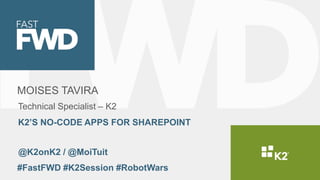 The document discusses K2's no-code applications for SharePoint, focusing on building and running workflow apps incorporating forms, data, and integration with line-of-business systems. It emphasizes the ability to empower users to solve business problems through mobile access and real-time tracking of processes. K2 for SharePoint enables the creation of business apps that automate workflows using SharePoint data and documents.