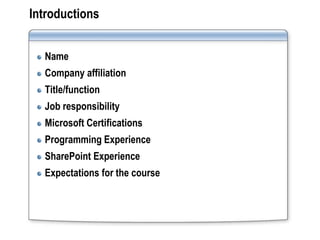This document discusses SharePoint governance and provides an overview of a SharePoint governance training course. It covers the importance of governance in managing a SharePoint environment, key components of an effective governance plan including people, processes, policies and technology, and examples of policies and guidelines that could be included in a governance plan such as content management policies. It emphasizes clear goals, vision, mission and metrics in governance planning and stresses the importance of executive sponsorship, communication and training for successful SharePoint governance.