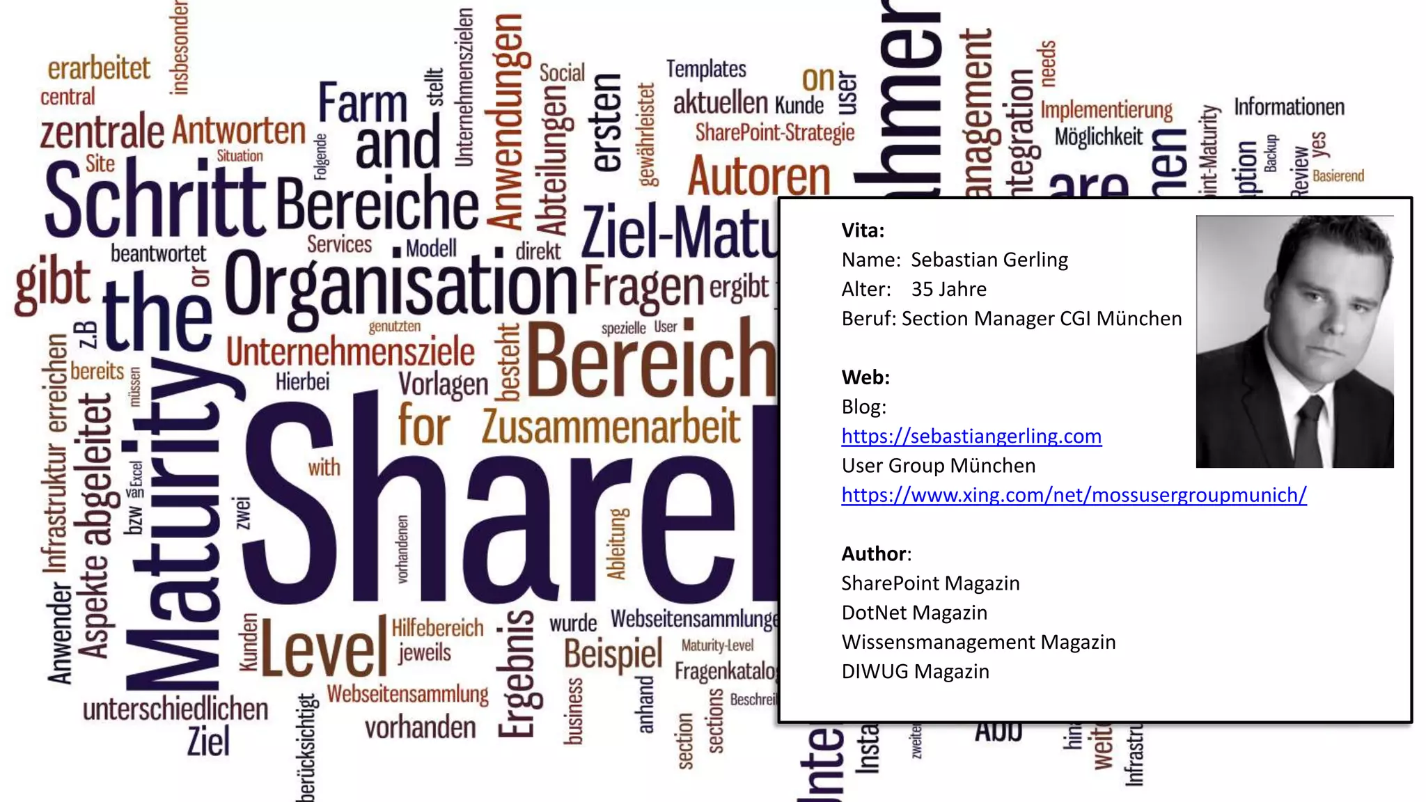 The document provides biographical information about Sebastian Gerling and lists his areas of expertise as a SharePoint consultant. It then outlines a holistic process for analyzing an organization's SharePoint maturity that involves defining the current strategy and target maturity, analyzing the actual situation, identifying gaps, defining measures to close gaps, and reviewing results. Finally, it provides examples of how infrastructure, search, and other areas could be rated on a maturity scale.