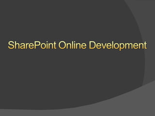 This document summarizes Microsoft Office 365 and SharePoint Online development. It discusses SharePoint Online administration and features, development using sandboxed solutions and the client object model in SharePoint Online, and accessing external data from SharePoint Online using services like Azure. Sandboxed solutions allow development with a subset of the server-side object model under security restrictions. The client object model provides a consistent way to access SharePoint Online content from various platforms.