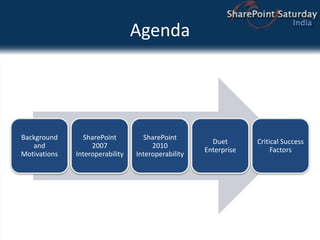 The document discusses the integration of SharePoint with SAP to enhance user experience and increase adoption rates, addressing common challenges faced in ERP implementations. It outlines the interoperability features available in SharePoint 2007 and 2010, including custom web parts, business connectivity services, and enterprise collaboration tools. Key points emphasize the need for proper user management and support mechanisms to ensure seamless functionality between the two platforms.