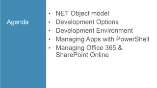 This document provides an overview of the SharePoint object model and how it can be used to programmatically access and modify SharePoint data. It describes the top-level objects like SPFarm, SPWebApplication, SPSite and SPWeb that represent different SharePoint scopes. It also discusses objects for lists, items, users and other entities. Examples are provided for common tasks like retrieving list data, adding users to roles, and handling list events. Best practices around object instantiation and disposal are also covered.
