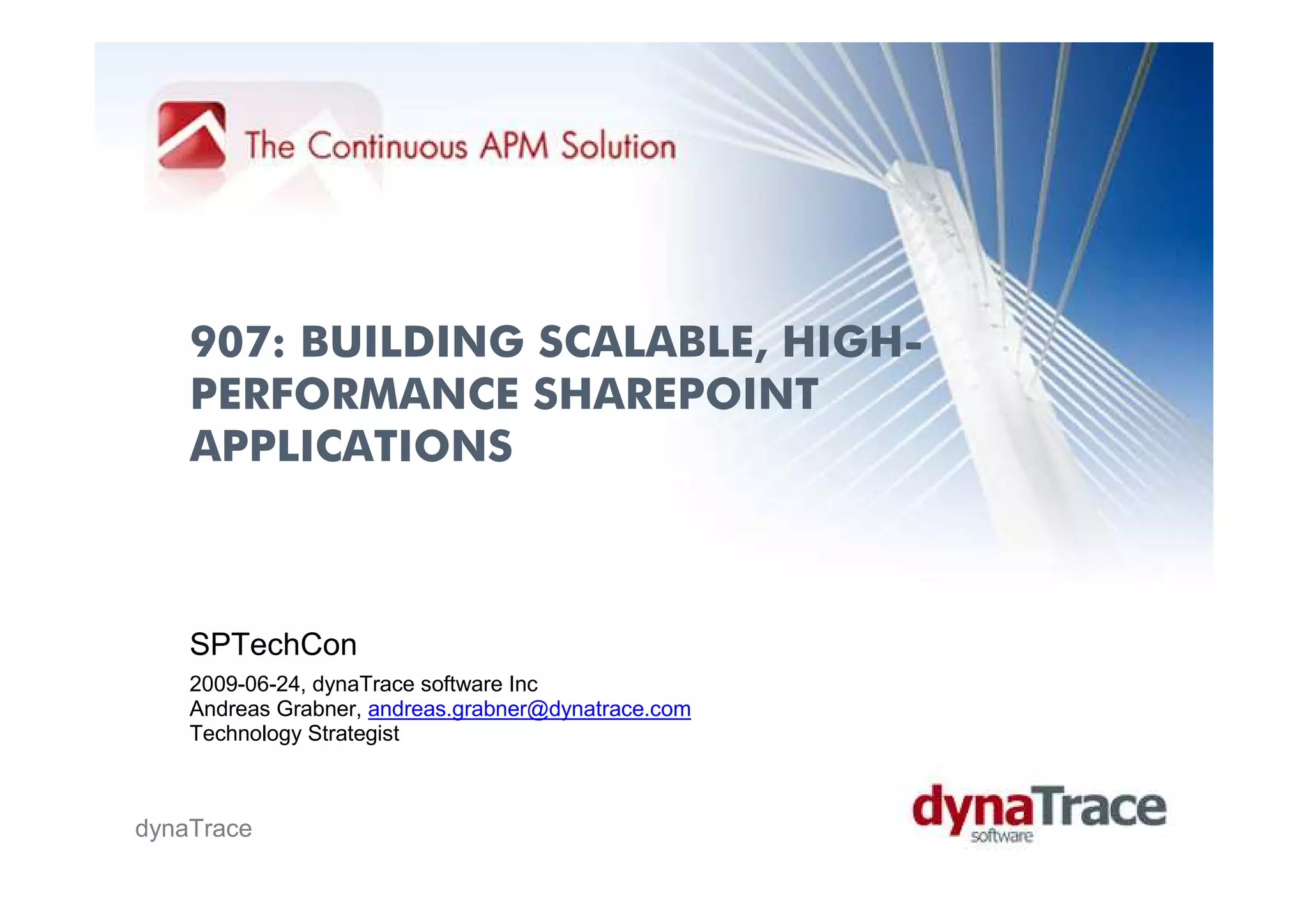 This document provides guidance on building scalable, high-performance SharePoint applications. It discusses considerations for working with SharePoint lists, accessing list data efficiently from code, updating lists in batches, and designing high-performing web parts. The document also provides links to additional resources and demonstrates monitoring and optimizing SharePoint resource usage.