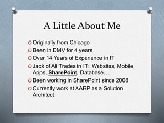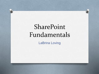 The document discusses SharePoint fundamentals presented by LaBrina Loving. It covers what SharePoint is, why organizations use it, its building blocks and terminology. Key points include that SharePoint is a platform used by 80% of Fortune 500 companies to manage documents, automate processes and collaborate. It discusses the SharePoint technology stack including farms, web applications, and content databases. Career opportunities and certification paths in SharePoint administration and development are also presented.