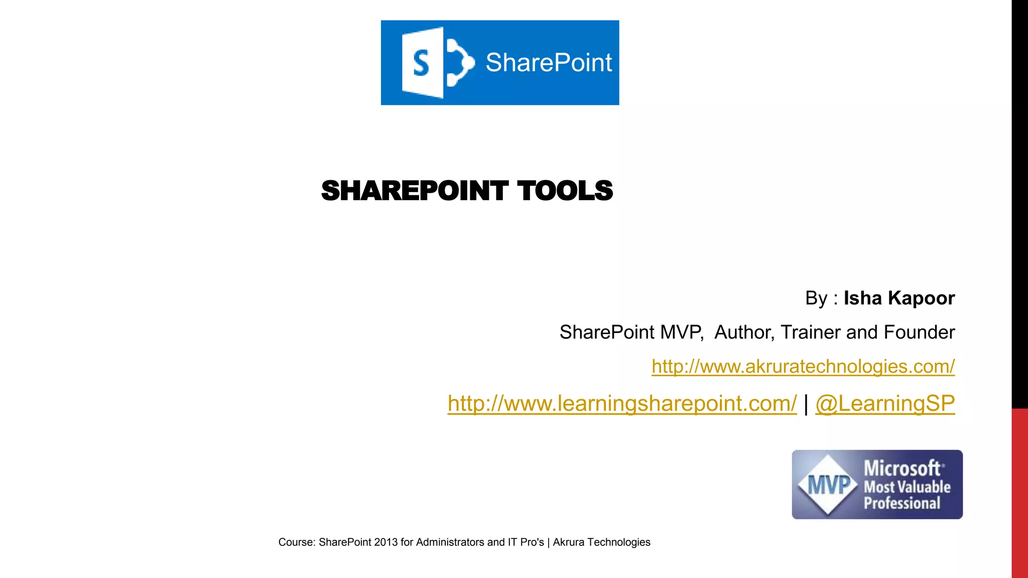 The document outlines a course on SharePoint 2013 for administrators and IT professionals, covering tools like SharePoint Designer for customizing sites and creating workflows. Key topics include modifying master pages, importing/exporting workflows, and designing forms with InfoPath 2013. It emphasizes the permissions needed to access SharePoint Designer and provides high-level steps for various customization tasks.