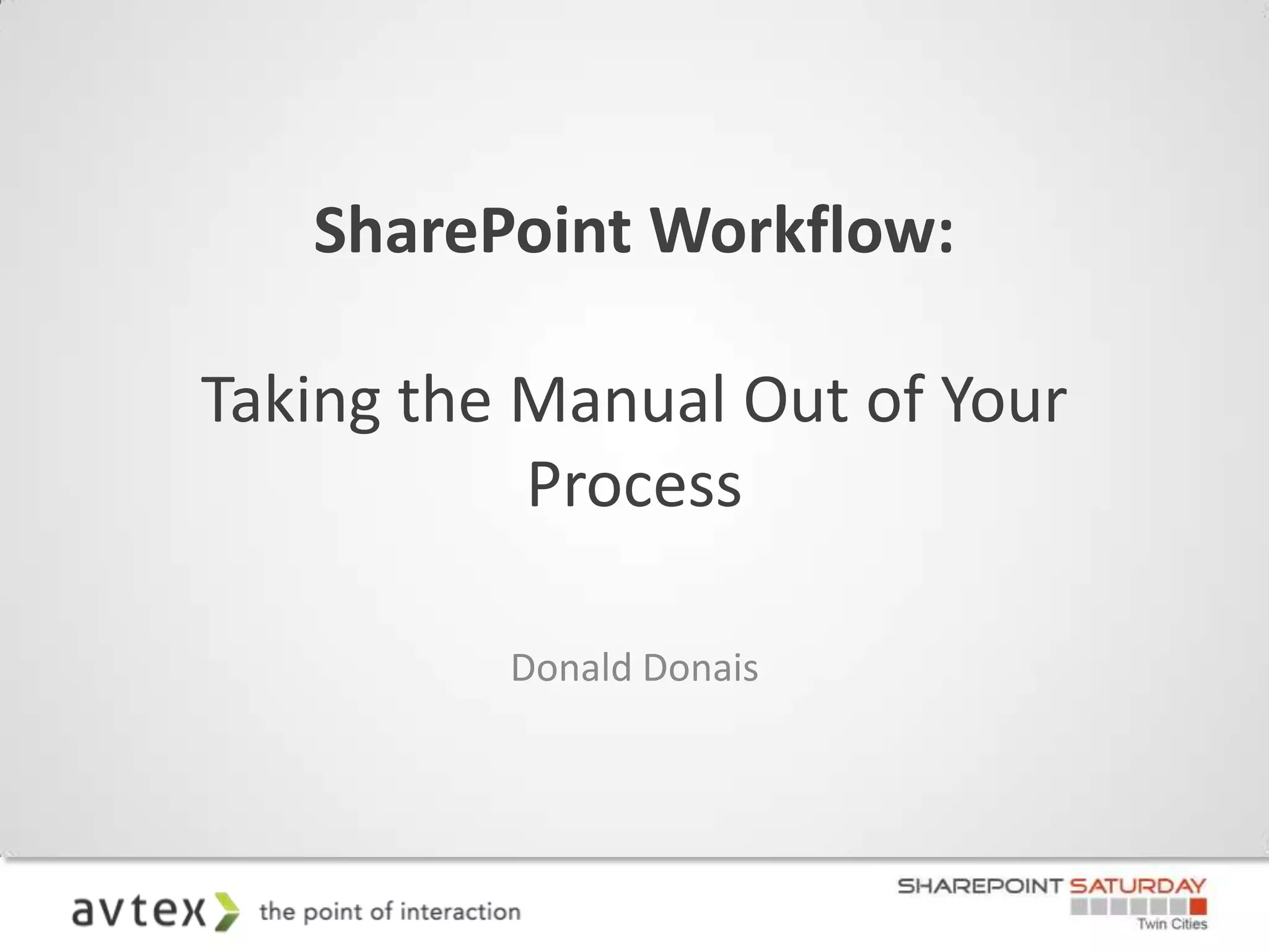 This document discusses automating business processes using SharePoint workflows. It begins with an overview of business process management and surveys of SharePoint users. It then provides tips for automating processes and introduces the "crawl, walk, run" approach to SharePoint workflows - starting with out-of-the-box workflows, then SharePoint Designer workflows, and finally custom .NET workflows. The document outlines the capabilities and lifecycle of workflows and compares workflow tools in SharePoint 2007 and 2010.