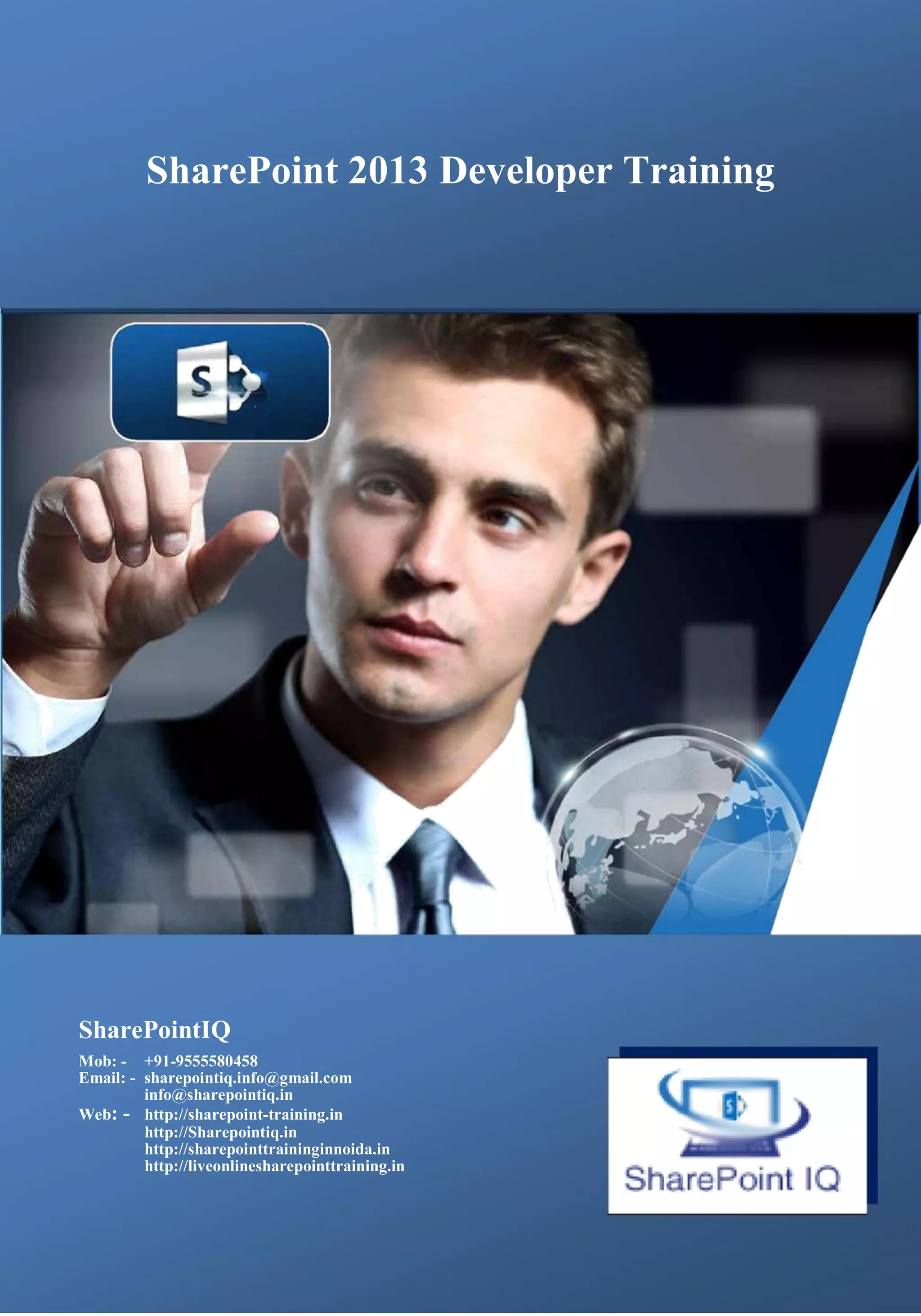 The document provides information about SharePoint 2013 developer training offered by SharePointIQ, detailing various courses that cover SharePoint server, administration, development, and app creation. It outlines the curriculum modules, which include working with SharePoint object models, managing permissions, designing features, client-side development, and automating business processes among others. The training aims to equip participants with the necessary skills to develop and manage SharePoint solutions effectively.