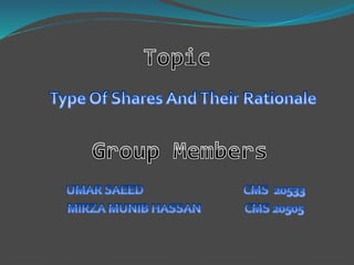 There are two main types of shares - common shares and preferred shares. Common shares give shareholders partial ownership, voting rights, and dividend income from company profits. Preferred shares give ownership but no voting rights, and priority over common shares for recovery of money if the company winds up. Preferred shares may also accumulate unpaid dividends or convert to common shares depending on their specific features. Shares are divided into different classes to provide varying dividend and voting rights to shareholders.