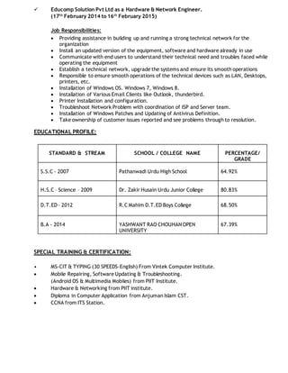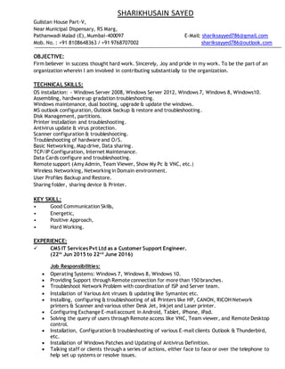 Sharikhusain Sayed is seeking a position that allows him to contribute substantially to an organization. He has over 2 years of experience as a Customer Support Engineer and Hardware & Network Engineer. His technical skills include installing and troubleshooting Windows, networking, antivirus software, printers, and remote desktop tools. He has a bachelor's degree in arts and certifications in hardware, networking, mobile repair, and computer applications.