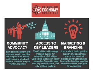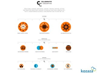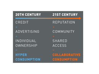 The document discusses the concept of the sharing economy, which emphasizes access to goods and services rather than ownership. It highlights the impact of technology and social values on collaborative consumption, along with its potential benefits for individuals, communities, and the environment. The report outlines various platforms and trends contributing to this economic model, while also touching on challenges related to trust and regulation.