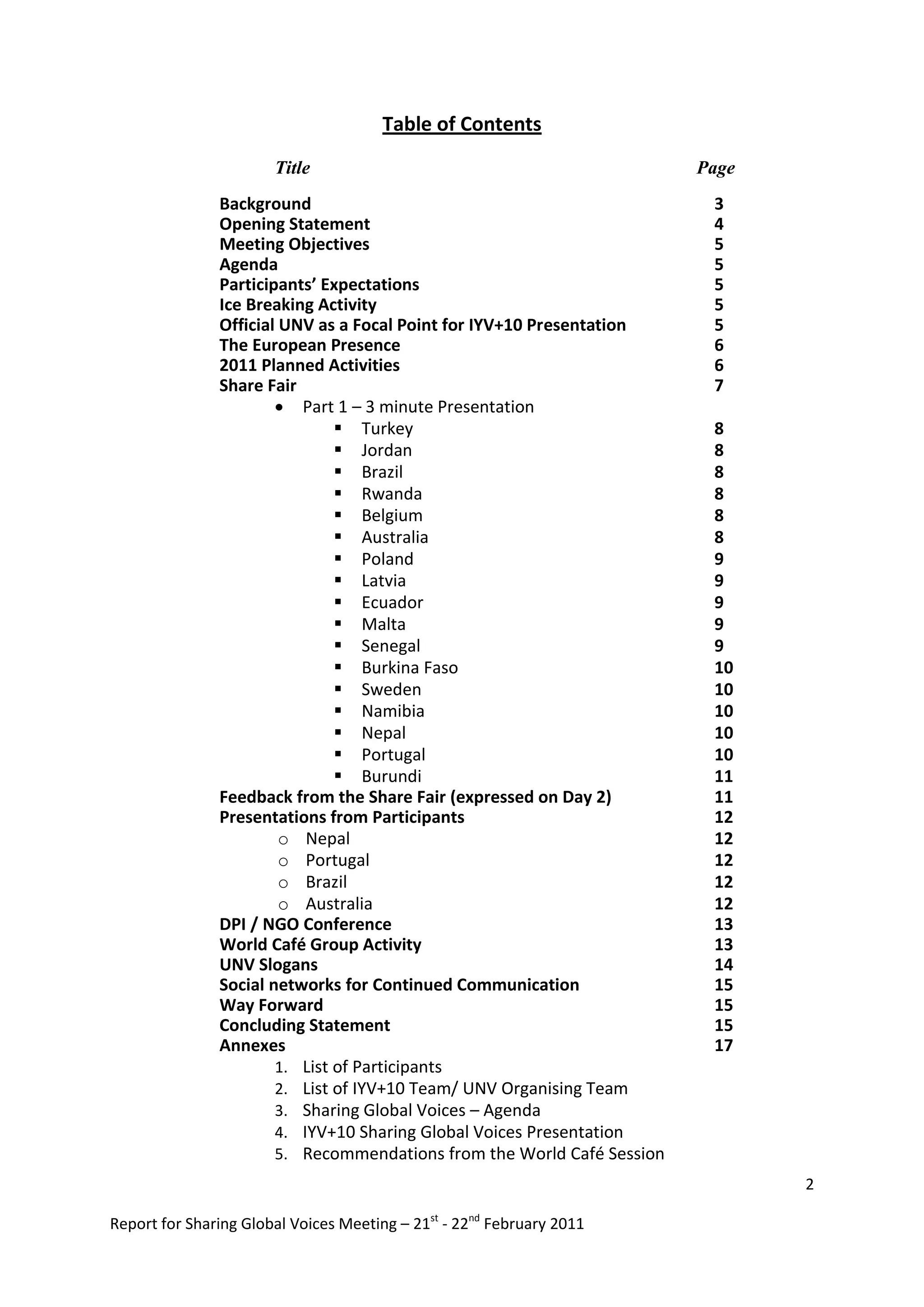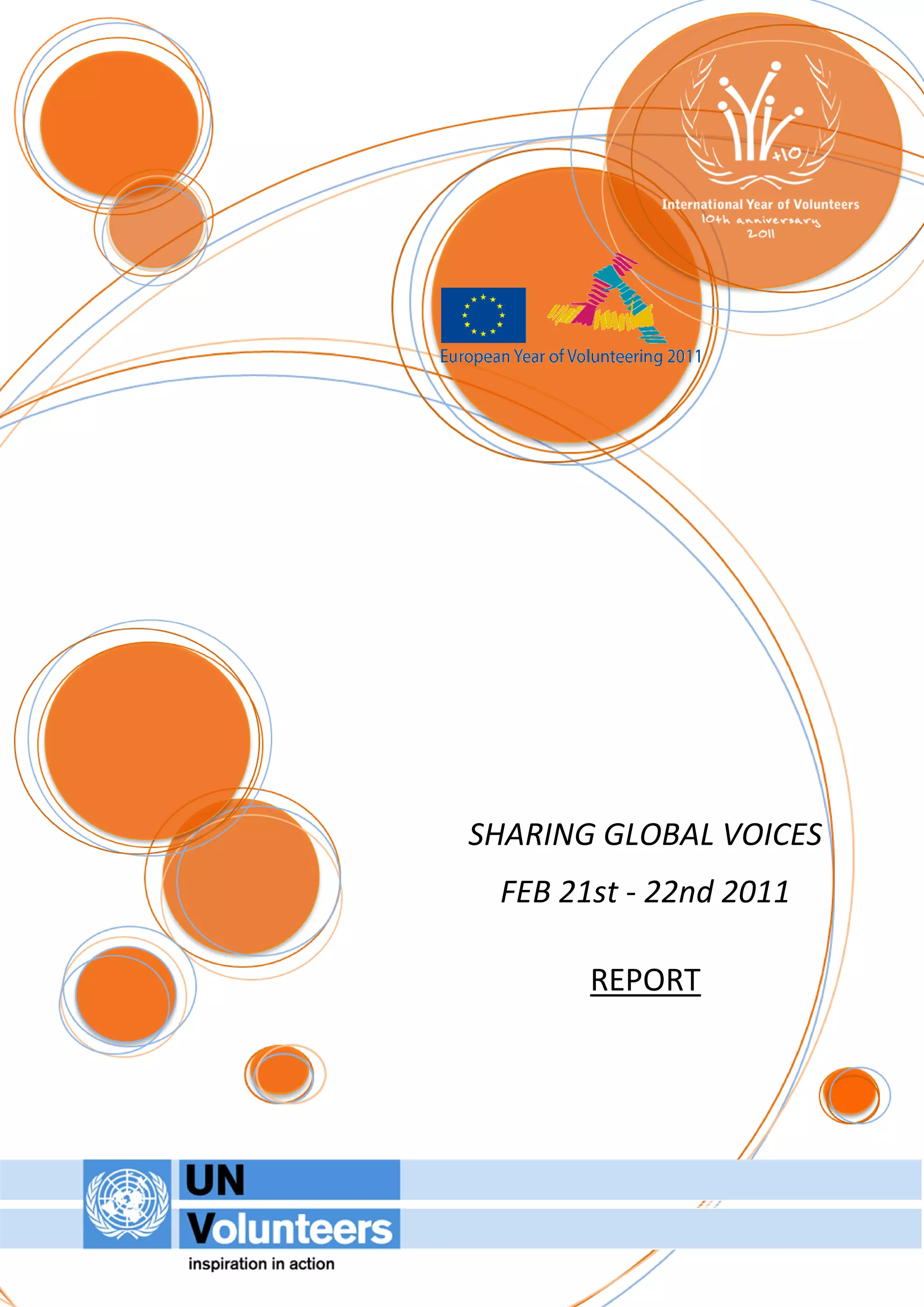 The document summarizes a two-day meeting held by UNV to mark the 10th anniversary of the International Year of Volunteers. Participants included national committees from 17 countries involved in commemorating IYV+10 and the European Year of Volunteering. The meeting objectives were to share information and practices, provide learning opportunities, and discuss volunteerism-related topics. A "Share Fair" allowed each country to present their work. Participants hoped to strengthen volunteer promotion, support for UN development goals, and policy influence through exchanging experiences. The meeting provided a forum for participants to network and continue supporting one another beyond IYV+10.
