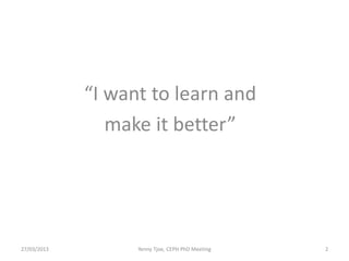 The document discusses preparing for a PhD confirmation seminar. It describes revising presentation slides to improve linkages between topics, provide more methodological details, and reduce the number of slides. Sample slides are included to demonstrate how the author addressed issues like linking contexts, explaining the sampling method, and justifying the research question. The author learned to fix problems, view the seminar as a learning process rather than an exam, and get feedback from others to best prepare for the confirmation seminar.