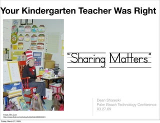 The document discusses the importance of sharing and the fundamental lessons learned in kindergarten, emphasizing values like cooperation, balance, and curiosity. It reflects on how personal networks can be more beneficial than traditional resources like Google and highlights the role of sharing in professional responsibility and feedback. The author encourages a mindset of creativity and connection through sharing various forms of content.