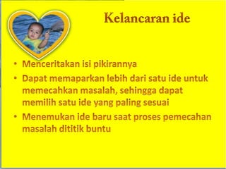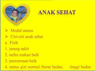 Dokumen tersebut membahas tentang tanda-tanda perkembangan anak pada usia 0-5 tahun, meliputi aspek psikis (emosi dan kognitif), fisik (berat badan, tinggi badan, lingkar kepala), dan kognitif (kemampuan berpikir kreatif dan menyelesaikan masalah). Dokumen juga menjelaskan bahwa perkembangan anak harus dipantau secara berkala pada rentang usia tertentu untuk memastikan pertum