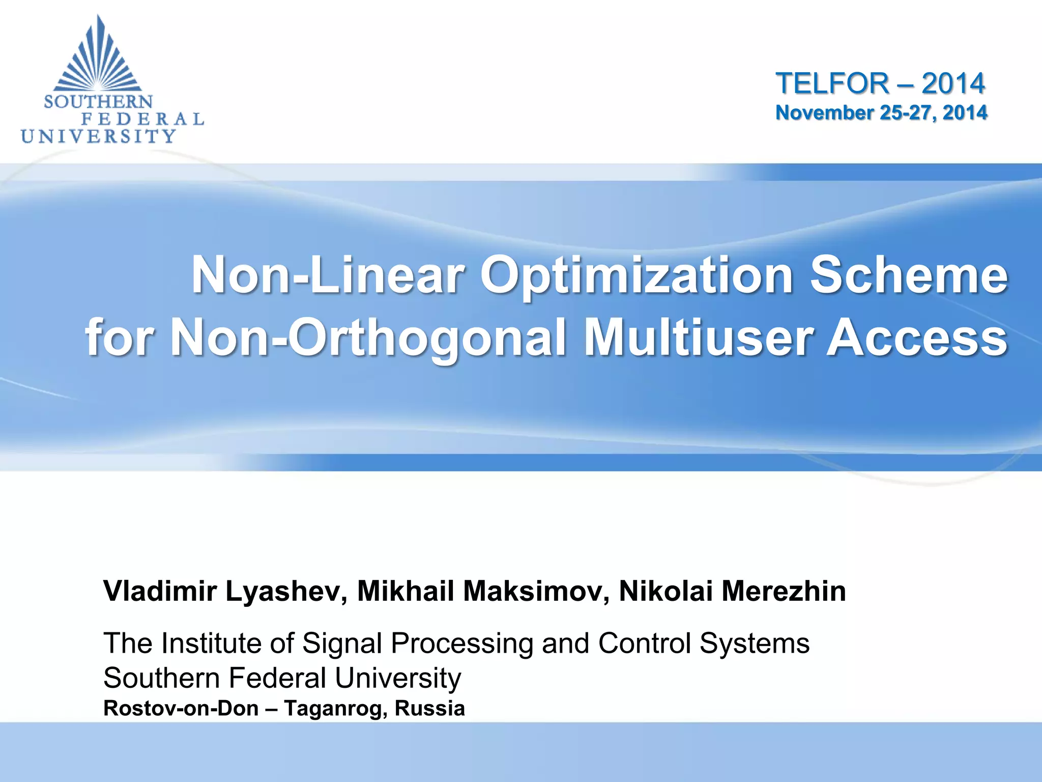The document presents a non-linear optimization scheme for non-orthogonal multiuser access aimed at future high-capacity communication systems. It discusses the issues related to intra-cell interference and provides mathematical models to address these challenges, along with various optimization methods including Tikhonov regularization and the Levenberg-Marquardt approach. The findings indicate that significant improvements can be achieved in wireless communication systems through these optimizations and highlight future research directions.