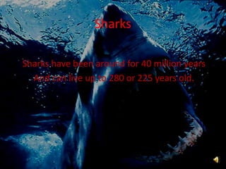 Sharks have been around for 40 million years and can live up to 280 years old. There are many different types of sharks including the great white shark, which grows up to 6 meters long. Sharks have rows of teeth that they use to bite prey and swallow it whole, and live in deep, warm waters around places like South Africa and North America. They are carnivorous and eat other animals but are often more afraid of humans than we are of them.