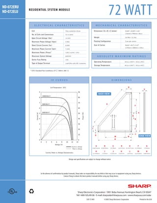 The document summarizes Sharp's ND-072ERU/LU triangular photovoltaic modules for residential solar systems. The modules have a maximum power output of 72W, use polycrystalline silicon solar cells, and have a black anodized aluminum frame and trim strips for aesthetic integration into homes. The modules are designed to increase light absorption and efficiency while providing a subdued, natural look and withstanding extreme heat and wind for residential applications.