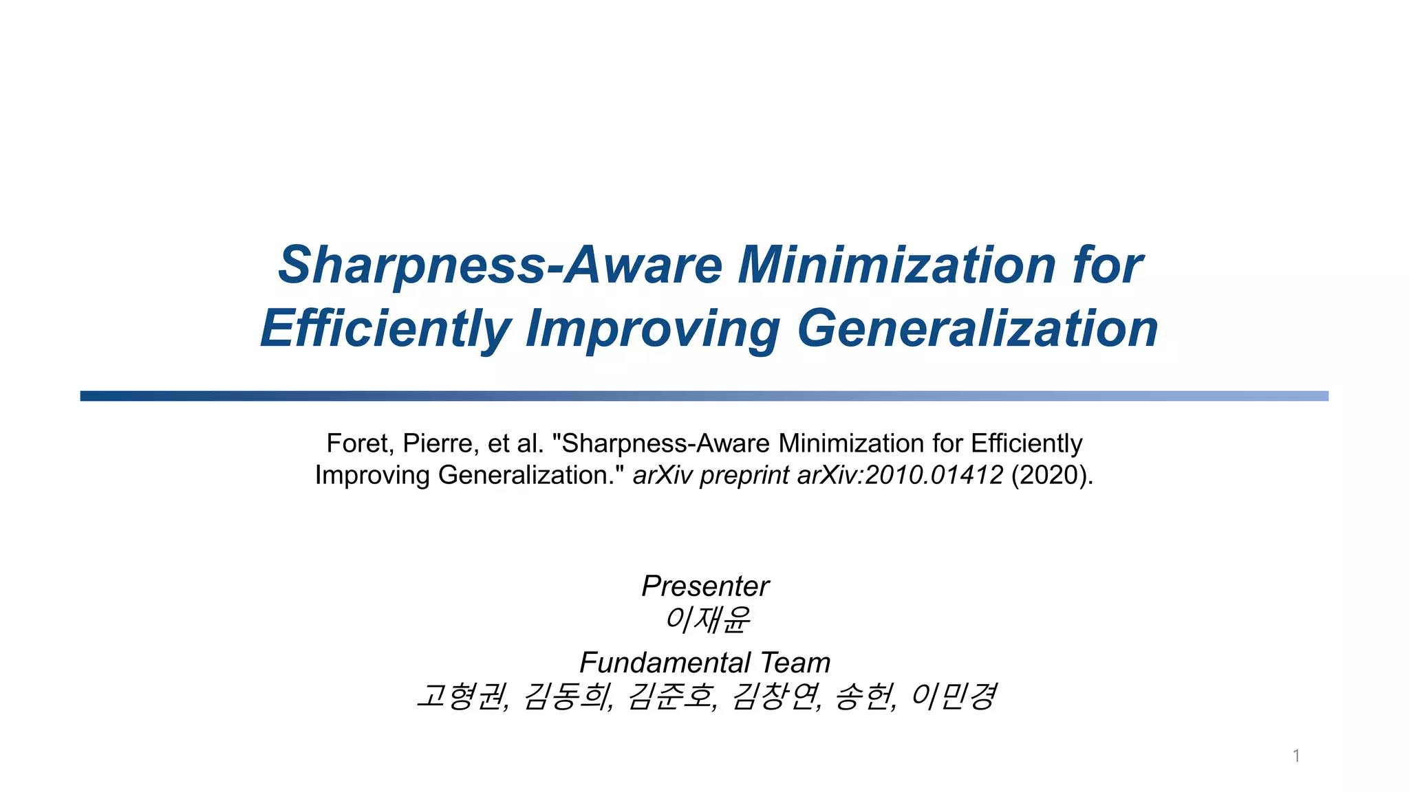 The document presents research on sharpness-aware minimization (SAM) as a method to improve generalization in deep learning, particularly for models trained with gradient descent methods like SGD. It discusses the correlation between loss sharpness and model generalization, explaining how SAM seeks to find flatter minima that enhance performance on various tasks including image classification and robustness to label noise. The approach involves minimizing upper bounds related to sharpness while also analyzing its effectiveness through experiments.