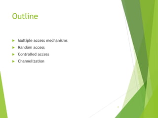 This document discusses multiple access mechanisms for data communication and computer networks. It covers random access techniques like ALOHA and slotted ALOHA. ALOHA uses a probabilistic approach where frames can be transmitted at any time, resulting in collisions if two or more stations transmit simultaneously. Slotted ALOHA divides time into fixed length slots to reduce collisions. Both techniques calculate throughput based on the average number of frames transmitted per time slot, with maximum throughput achieved at 0.184 for pure ALOHA and 0.368 for slotted ALOHA. Examples are provided to demonstrate calculating throughput for different frame transmission rates.