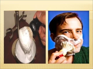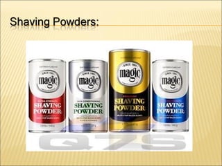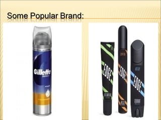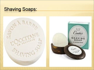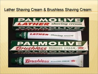 The document provides an overview of shaving cream, including its history, types, manufacturing process, quality control, criteria, applications, side effects, comparisons to other products, popular brands, and references. It discusses how shaving cream is made through heating and cooling various raw materials like oils and surfactants to form an emulsion. Quality control testing examines factors like pH levels. Shaving cream softens hair and skin to allow for a smoother shave while also cleaning and lubricating surfaces around the home.
