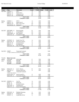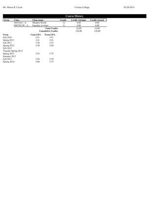 This document is a course history transcript for Shawn R. Caven from Ursinus College showing the courses taken each term from Fall 2010 to Spring 2014, along with grades, credits earned, and cumulative GPA. Over the course of his college career, Caven took a variety of courses including CIE, German, political science, education, history, English, and more. He maintained a cumulative GPA above 3.5 and earned a total of 128 credits by Spring 2014.
