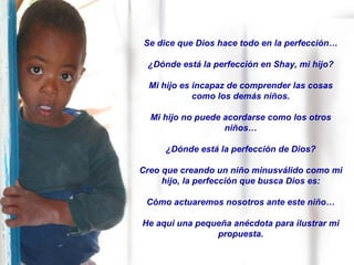 Durante una cena di beneficenza, un padre racconta la storia emozionante di suo figlio Shay, un bambino con disabilità, che, grazie al supporto dei compagni di squadra, riesce a conquistare la vittoria in una partita di baseball. Il padre riflette sul significato di perfezione e sull'importanza dell'umanità e della solidarietà, mostrando come i veri valori si manifestino nella compassione e nell'inclusione. Le ultime osservazioni richiamano l'attenzione su come la società spesso dia priorità a valori superficiali, dimenticando l'importanza di connessioni autentiche e sostegno reciproco.