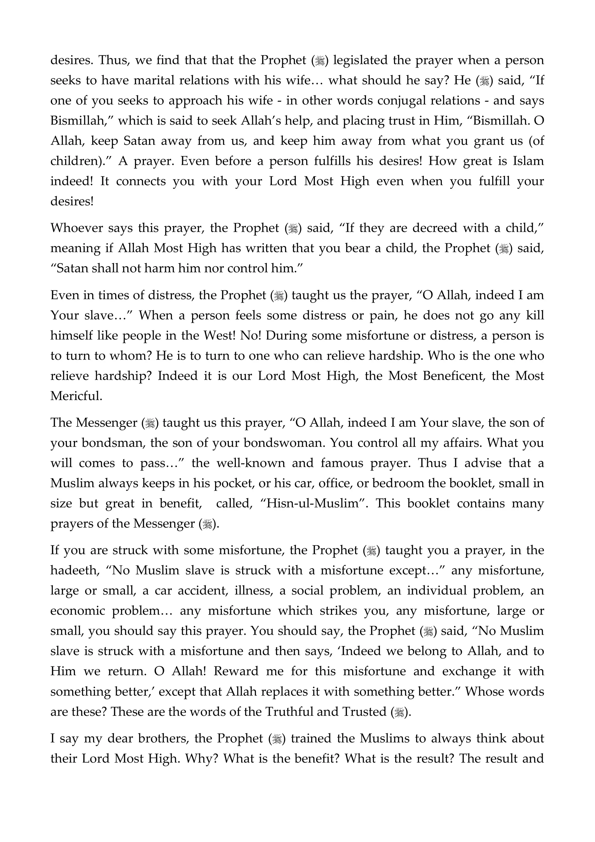 This document summarizes a lesson about supplications from Sheikh Khalid Al-Husainan. It discusses how the Prophet Muhammad (peace be upon him) would constantly think about and invoke Allah throughout his daily life. As a result, he prescribed supplications for Muslims to recite during various situations like waking, sleeping, entering/leaving places, times of distress, fulfilling desires, etc. Reciting these supplications strengthens one's faith, keeps Satan away, and connects one to Allah even during mundane acts. The lesson urges Muslims to memorize these supplications so they can live peacefully with Allah's protection.