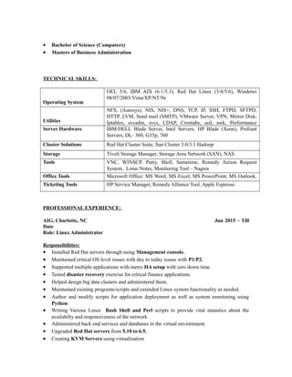 - Over 7 years of experience as a Linux Administrator with expertise in Red Hat, SUSE, Ubuntu, VMware, Oracle VM, Hadoop, Puppet, OpenStack, and scripting languages.