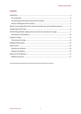 Module 4 of the School for Health and Care Radicals focuses on making change happen within health and care systems, emphasizing the importance of aligning intrinsic and extrinsic motivators for successful change. The guide explores reasons for the failure of change efforts, strategies to build shared purpose, and the NHS change model as a framework for integrating various components of change. Additionally, it encourages reflection on personal goals and experiences while providing resources and questions for deeper engagement in the change process.