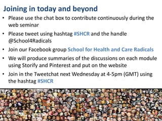 The document outlines a web seminar led by the School for Health and Care Radicals, focused on nurturing transformational change agents in health and care. It emphasizes the importance of community, shared knowledge, and the characteristics of effective change agents, including self-efficacy and engagement with diverse perspectives. The seminar encourages participants to become certified change agents while highlighting the need for practical and relational learning in driving systemic improvements.