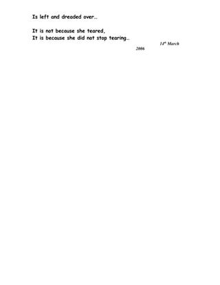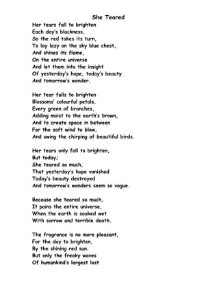 The poem describes a woman who cries to brighten the world with her tears. However, one day she cries so much that yesterday's hope vanishes, today's beauty is destroyed, and tomorrow's wonders seem vague. When the earth becomes soaked with sorrow and death from her excessive tears, it pains the entire universe. The pleasant fragrances are gone, and only the waves of humankind's largest loss are left in the aftermath of her inability to stop crying.