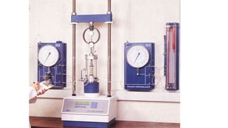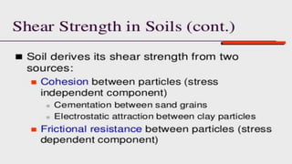 The document discusses shear strength of soils and describes the triaxial shear test. It explains that the triaxial test subjects a soil specimen to three compressive stresses in perpendicular directions to measure its mechanical properties. Direct shear and triaxial tests are described and compared. The triaxial test apparatus and procedures for unconsolidated-undrained, consolidated-undrained, and consolidated-drained triaxial tests are outlined. Advancements in triaxial testing options and conclusions on benefits of the triaxial test are presented.