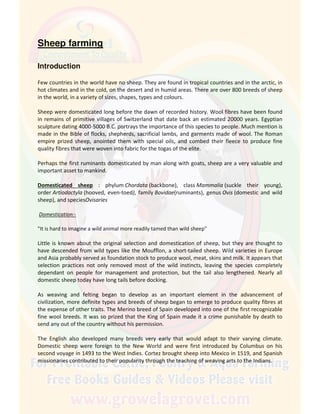 Sheep farming is a significant agricultural activity found in various climates globally, with over 800 breeds cultivated for their valuable meat, wool, and other by-products. The document highlights the domestication and variety of sheep, their adaptability to different environments, and their role in supporting livelihoods in arid regions, particularly in India. Furthermore, it details the productivity challenges faced in sheep farming, the importance of proper grazing management, and the economic contribution of sheep to national economies.