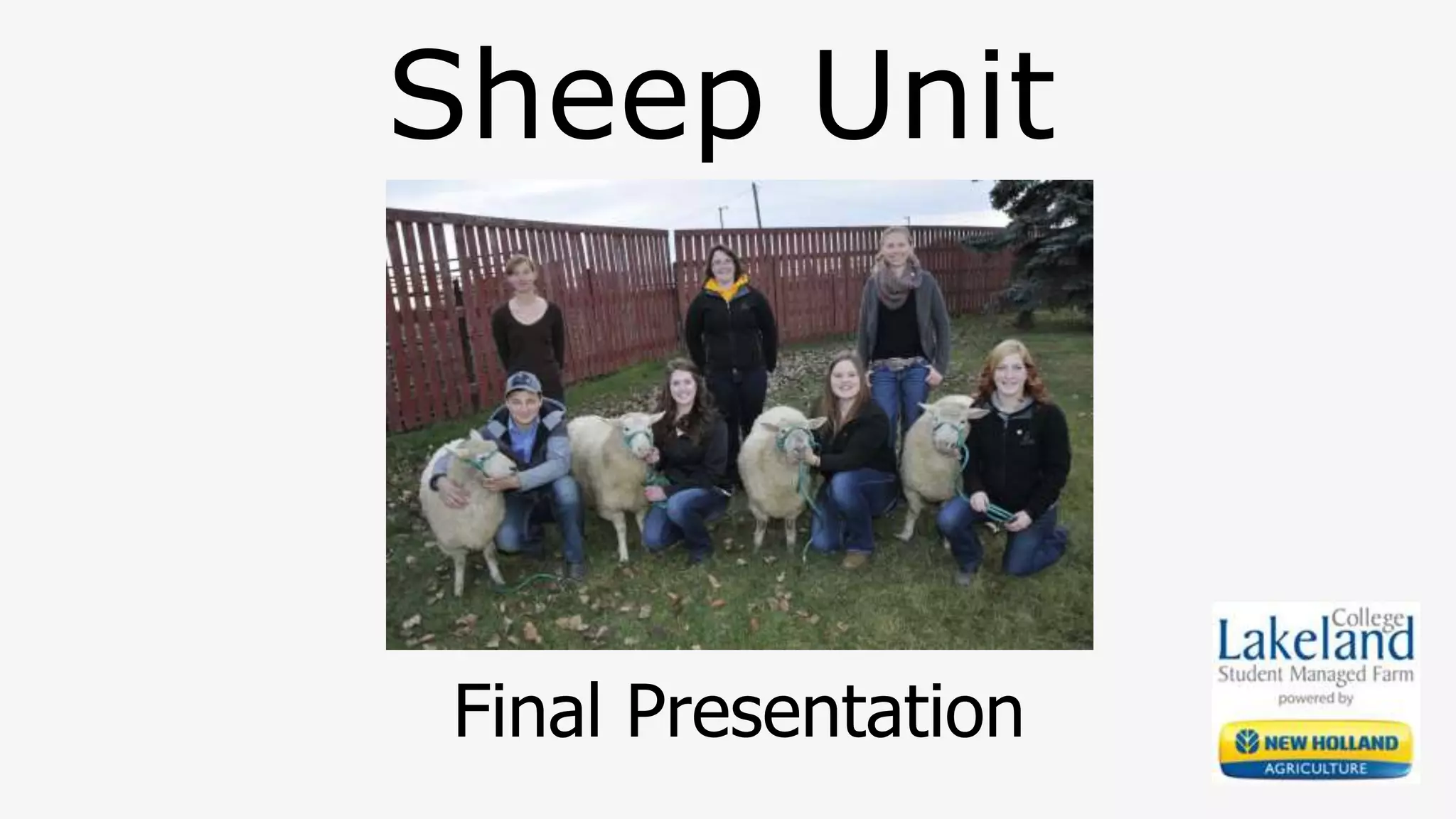 The document provides details from the final presentation of the Sheep Unit team. It introduces the team members and their roles. It then summarizes the flock inventory, financial outlook which showed a loss, and recommendations for the next year which include securing long term pasture and increasing the purebred flock. Key performance indicators such as lambing percentage and mortality are also reviewed.