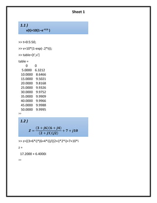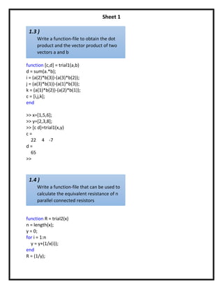 The document contains code snippets and outputs from MATLAB calculations. It defines functions to calculate: