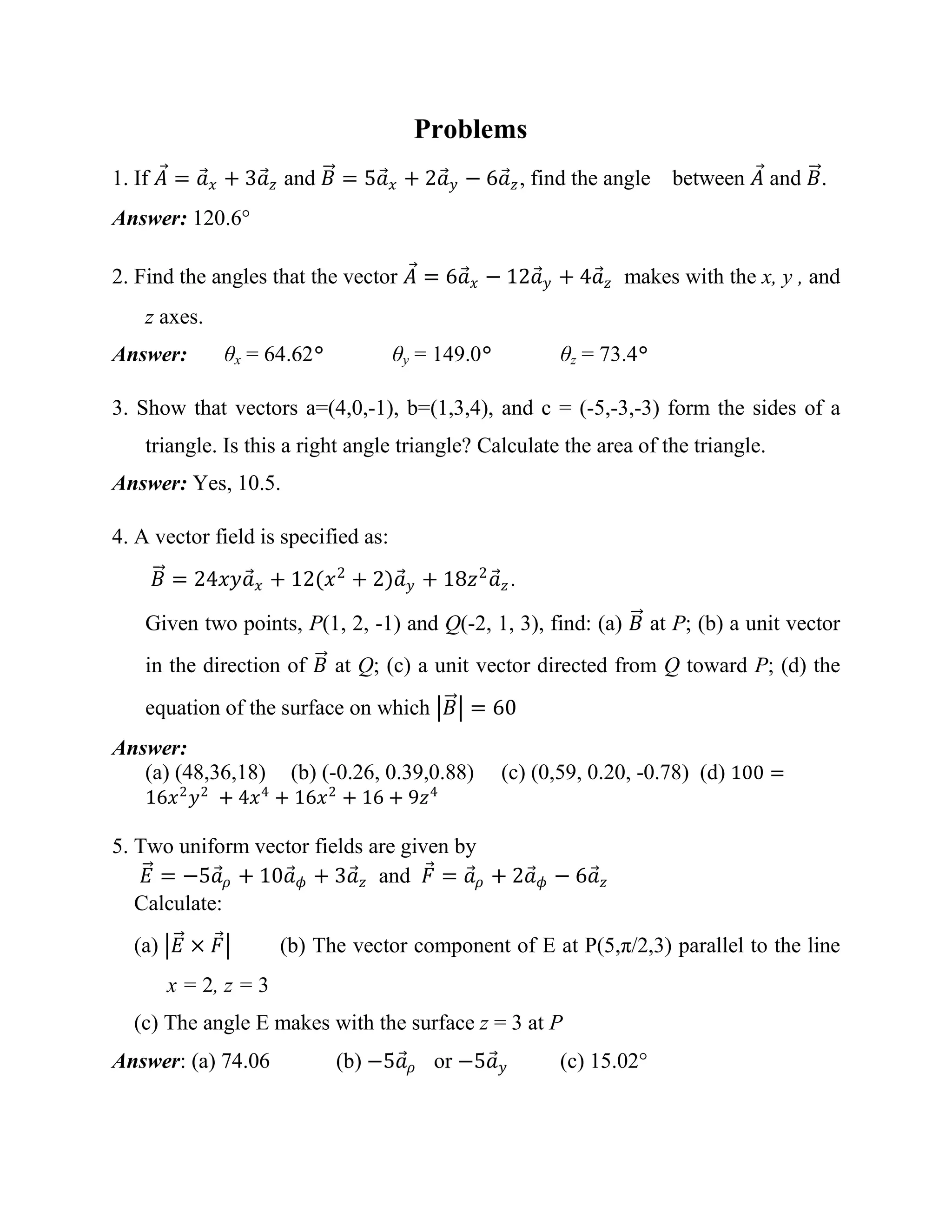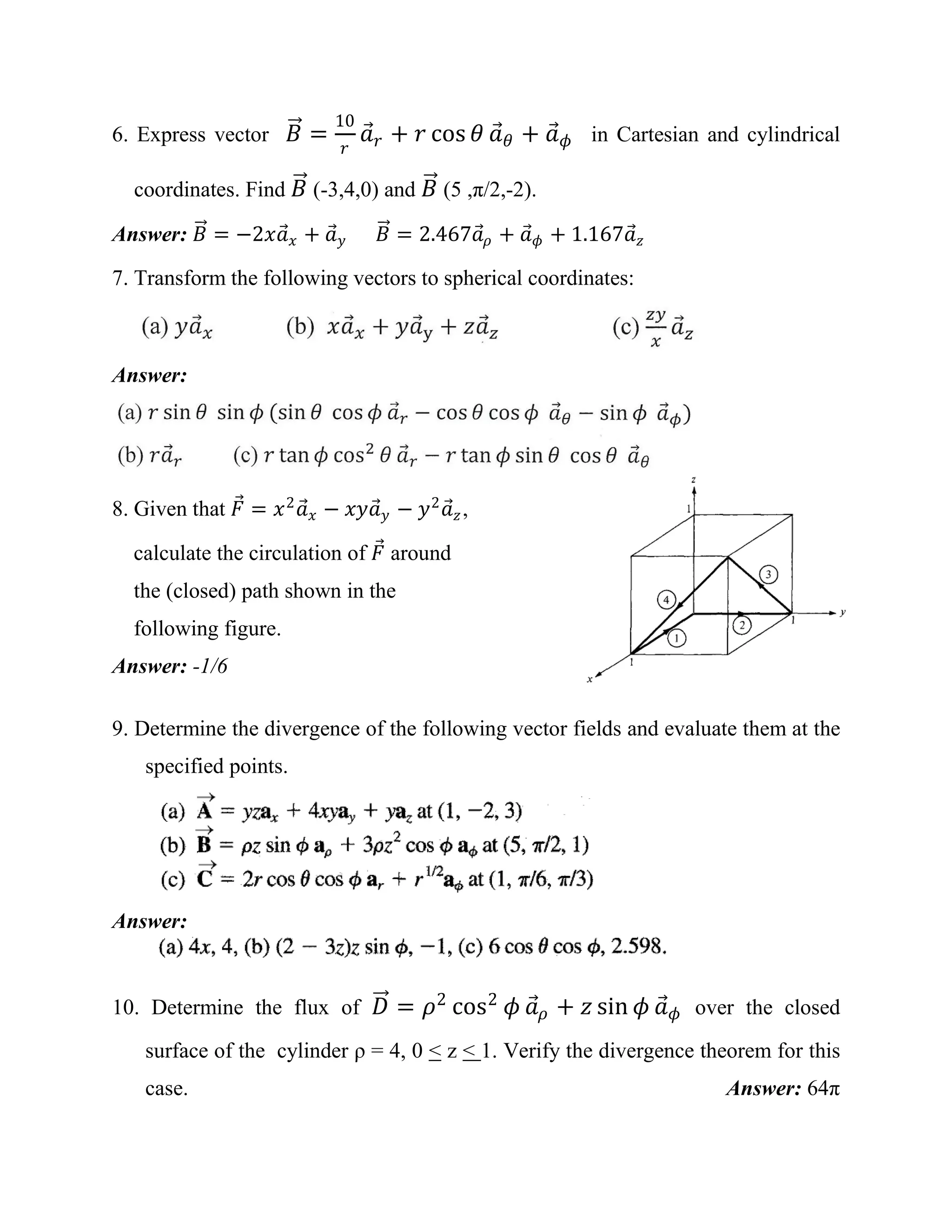 The document contains 11 multi-part math problems involving vector calculus concepts like divergence, flux, and curl. It provides the problems, calculations, and answers for finding things like the angle between two vectors, components of a vector field, and evaluating vector expressions at given points and over surfaces using theorems like divergence and Stokes' theorem.
