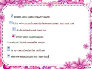 хэмжээг өөрчлөх Мөрийн хэмжээг өөрчлөх • 1.Хэмжээг өөрчлөх мөрийг идэвхжүүлээд • 2.Home/Cells/Format командыг сонгоно. ̺ðèéí • 3.Нөээгдэх дэд цэснээс õýìæýý ººð÷ëºõ Row Height… -г сонгож мөрийн хэмжээг сонгоно.