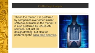The document discusses the advantages and features of using CATIA software for CAD/CAM services, emphasizing its capabilities in design, drafting, analysis, and modeling. It highlights various aspects such as CATIA drafting standards, mold tooling and turbine blade design, as well as the importance of CAD design services and effective project management. Additionally, it mentions the expertise of the company in providing high-quality CAD services and their focus on customer satisfaction.