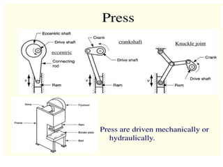 This document discusses sheet metal processes. It begins by defining sheet metal working as a chipless manufacturing process that forms various components from sheet metal using punching and other forming operations. It then discusses various sheet metal cutting operations like blanking and punching as well as forming operations like bending, drawing, and coining. Specific processes like fine blanking, deep drawing, and springback compensation techniques are also covered. The document provides examples of applications for sheet metal working and discusses concepts like tooling dimensions, forces, and developed lengths.