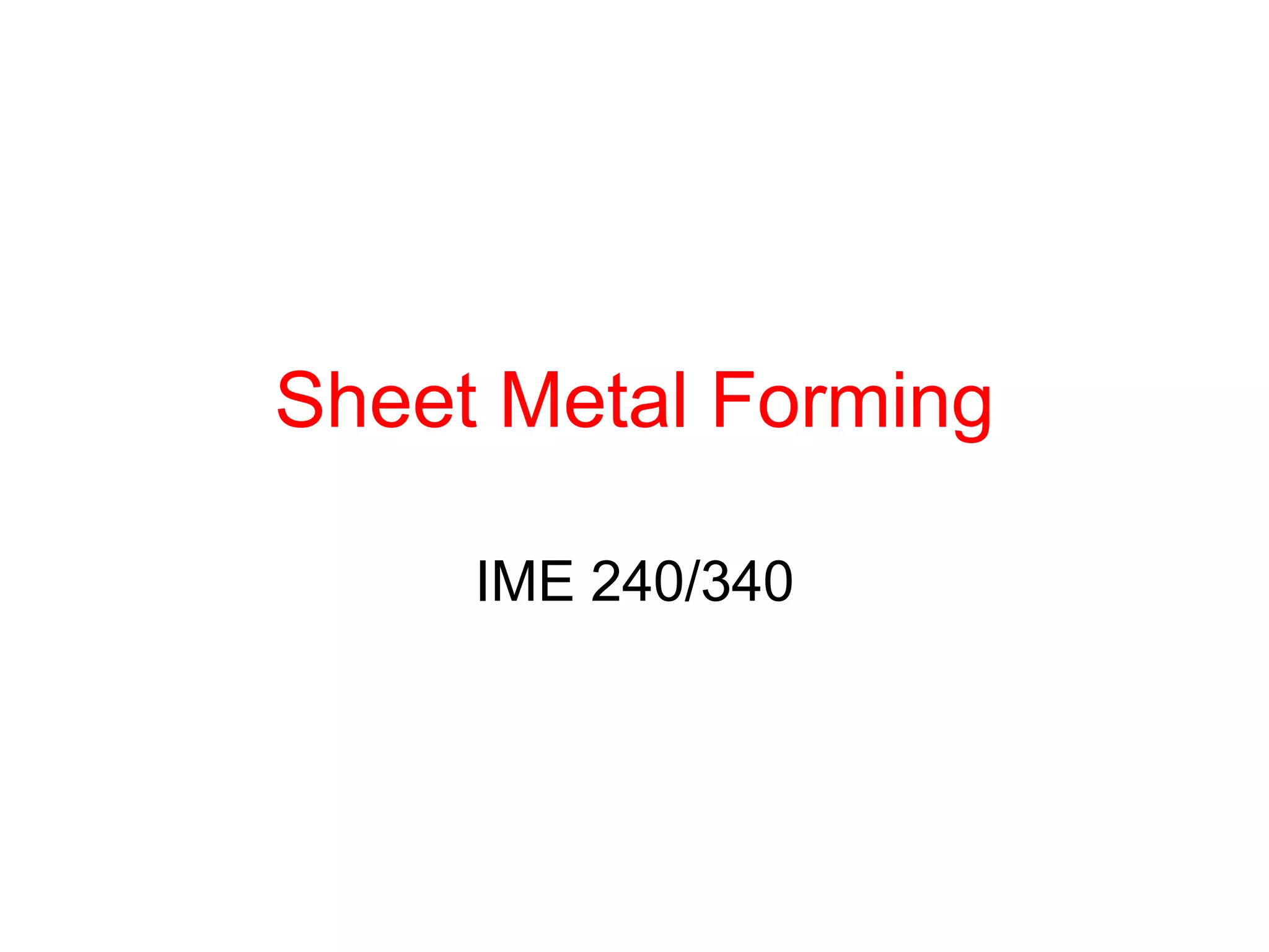Sheet metal forming is a versatile manufacturing process used to produce lightweight parts with complex shapes. Common forming operations include punching, blanking, bending, deep drawing, and stamping. Key considerations in sheet metal forming include the material properties, forming limits, stresses induced during forming, and techniques to reduce waste and improve dimensional accuracy. Proper tool and die design is critical for successful forming of sheet metal parts.