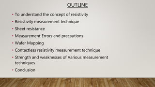 The document discusses techniques for measuring resistivity and mapping resistivity variations across semiconductor wafers. It begins by defining resistivity and listing typical resistivity values for different materials. It then describes two common measurement techniques: two-point probe and four-point probe. Four-point probe is more accurate as it eliminates lead and contact resistance. Factors that affect measurement accuracy like sample size, carrier injection, and probe spacing are also covered. The document concludes by explaining techniques for wafer mapping like double implant, modulated photoreflectance, and optical densitometry.
