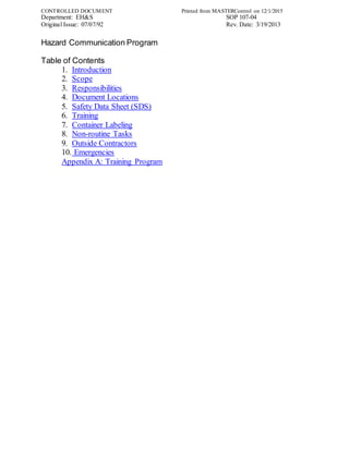 This document outlines the Hazard Communication Program for Sheffield Pharmaceuticals. It describes the program's responsibilities, document locations, safety data sheet procedures, training requirements, container labeling, and emergency response. The program is designed to ensure employees are informed of chemical hazards and properly protected according to OSHA regulations.
