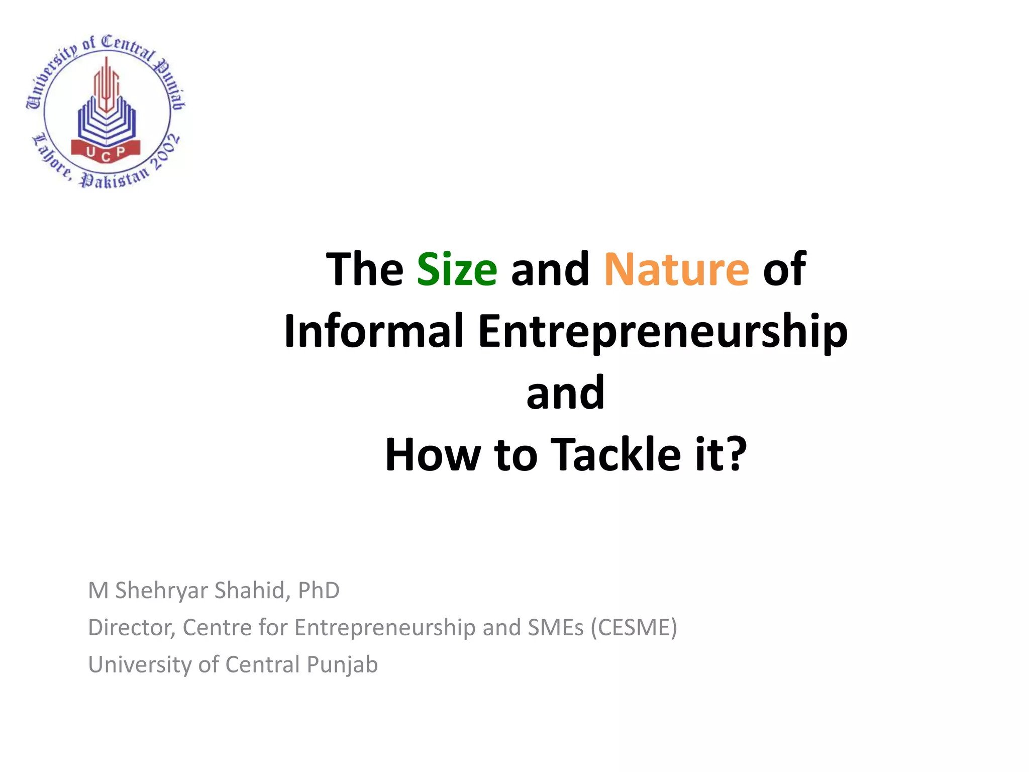 The document summarizes research conducted on the size and nature of informal entrepreneurship in Pakistan. It provides details on how the research was conducted, including defining informal entrepreneurship, developing research questions, sampling methodology, data collection tools, and analysis plan. Key findings include that over 40% of small businesses operate informally, with the majority citing complex regulations and taxes as barriers to formalization. Qualitative interviews found small business owners face challenges like complicated laws that officials exploit for bribes and restrictive regulations. The research aims to inform policy measures to better support and formalize Pakistan's informal entrepreneur sector.