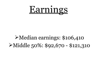 This document summarizes information about the career of a pharmacist. Median earnings for pharmacists are $106,410 annually with middle 50% earning between $92,670 to $121,310. Pharmacists must complete 2 years of prerequisite coursework and obtain a 4-year Pharm.D degree. Pharmacists work in various settings like retail stores, hospitals, and can eventually become supervisors or advance to executive roles. The job outlook for pharmacists is expected to grow faster than average between 2008-2018.