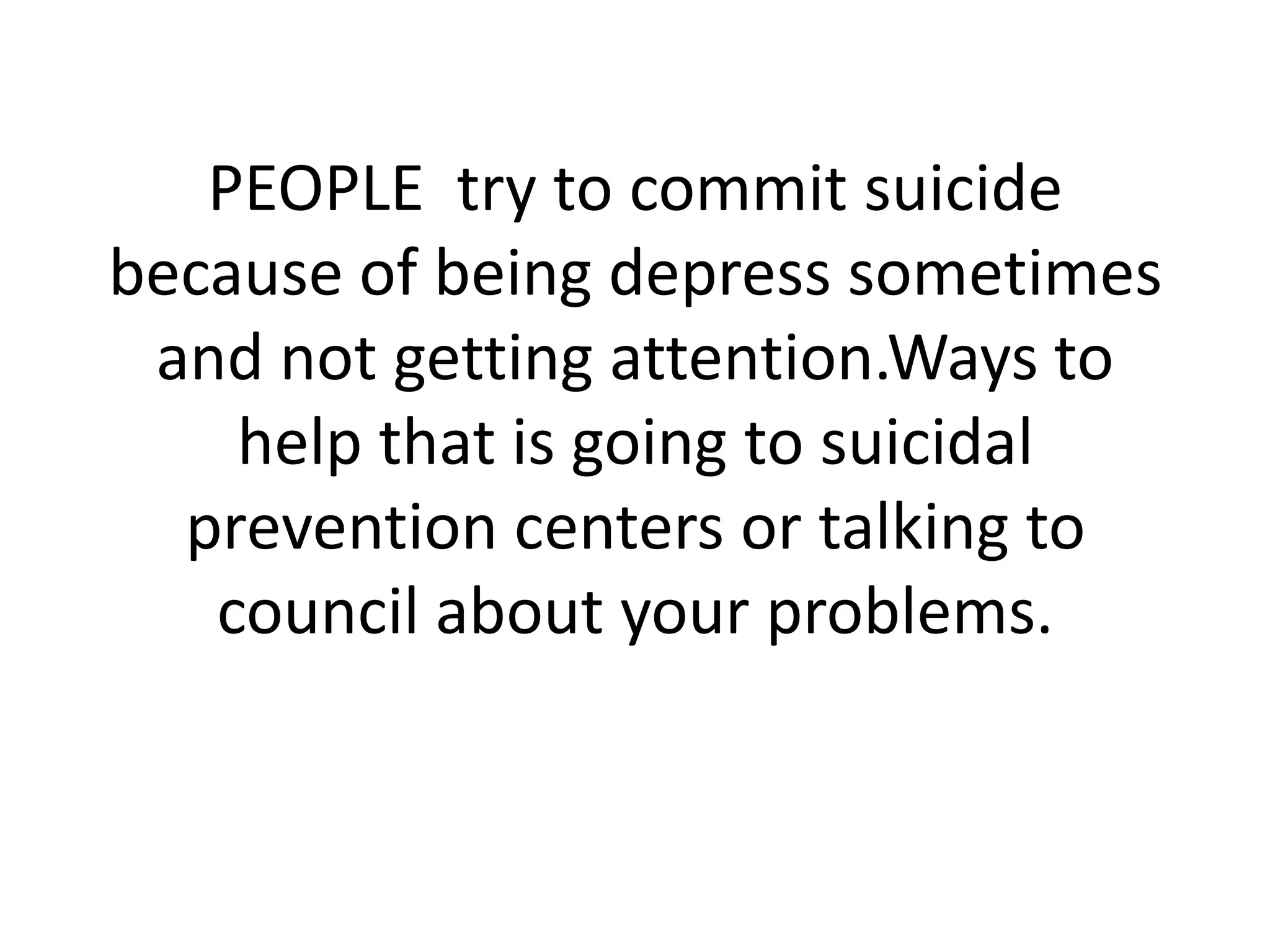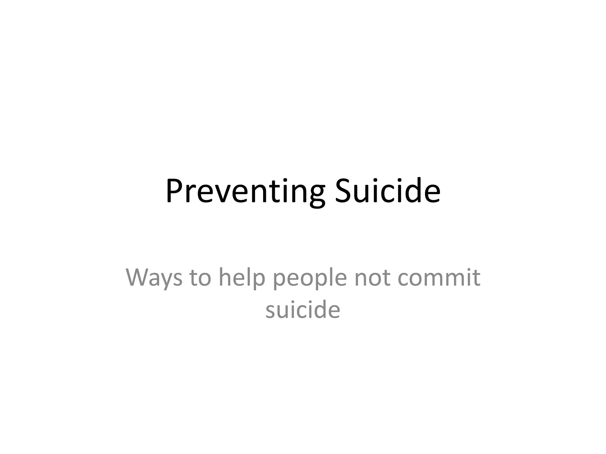 This document provides information on preventing suicide and helping those who are suicidal. It discusses reasons why people may consider suicide, such as depression, lack of attention, or life changes. It recommends seeking help from suicide prevention centers or counseling. It also provides tips for recognizing if someone may be suicidal based on their words, actions, and demeanor. Suggestions for helping prevent suicide include removing weapons, keeping the individual occupied and supervised, and making sure they get support from loved ones or professional help.