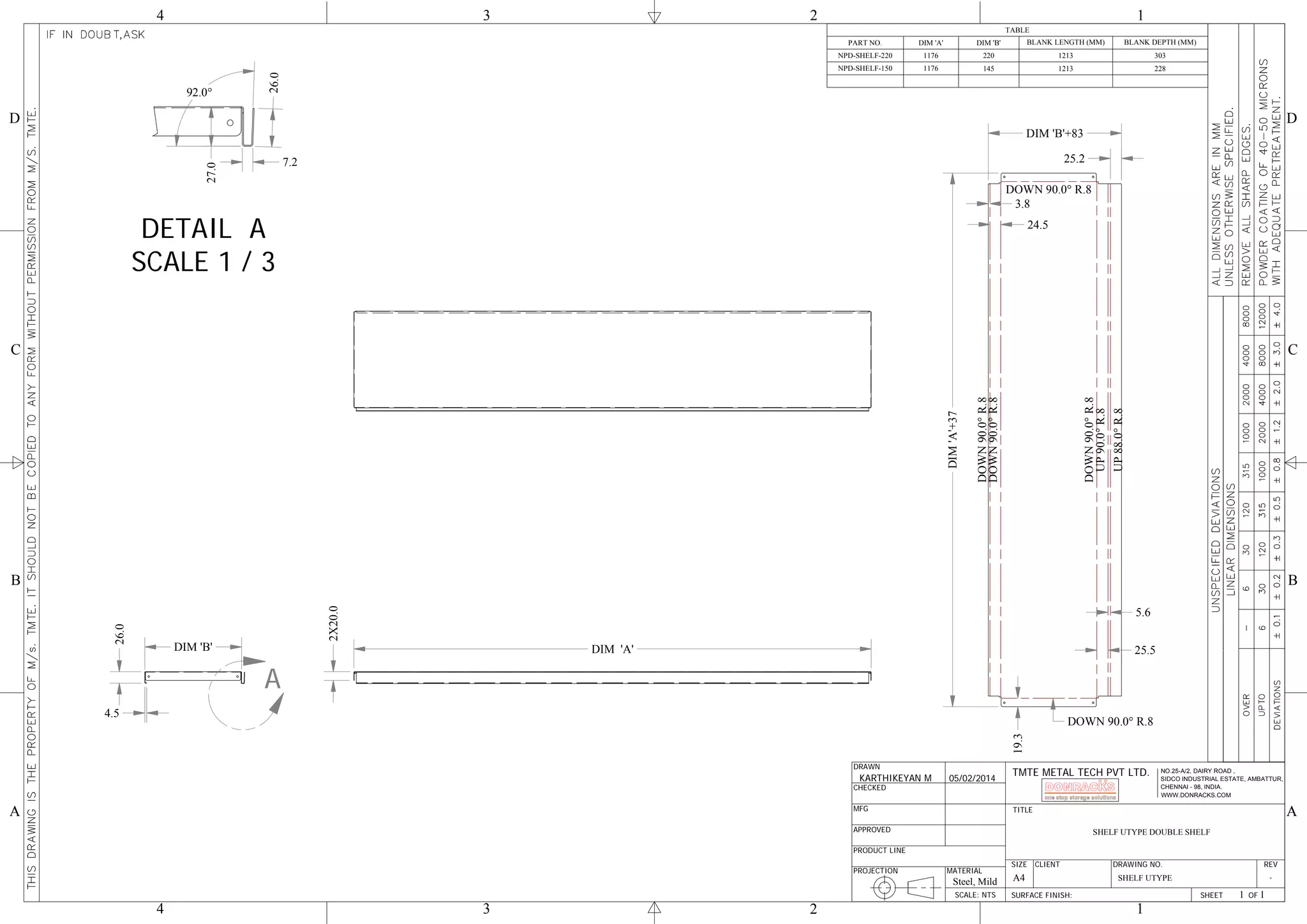 This document is an engineering drawing for a double shelf unit. It includes dimensions for two shelf models, technical specifications like material used and surface finish, as well as manufacturing details such as tolerances and a note about removing sharp edges. The drawing also contains title block information crediting the designer and manufacturer.