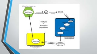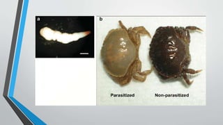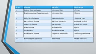 1. This document summarizes 10 parasitic diseases that affect finfish and shellfish: cotton shrimp disease, Hepatopancreatic microsporidiosis, milky blood disease, Perkinsozoa disease, grey crab disease, Aber disease, bonemiasis, Bucephalian disease, Echinocephalus disease, and diseases caused by polychaetes.